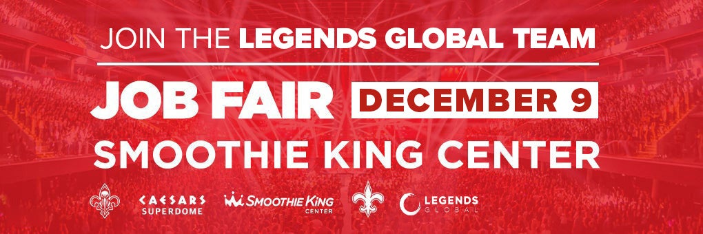 We are looking for dedicated and hardworking individuals to join our Legends Global Team! Join us at our Job Fair on the floor of the Smoothie King Center on December 9 from 9AM - 1PM, and be a part of the biggest events in New Orleans.