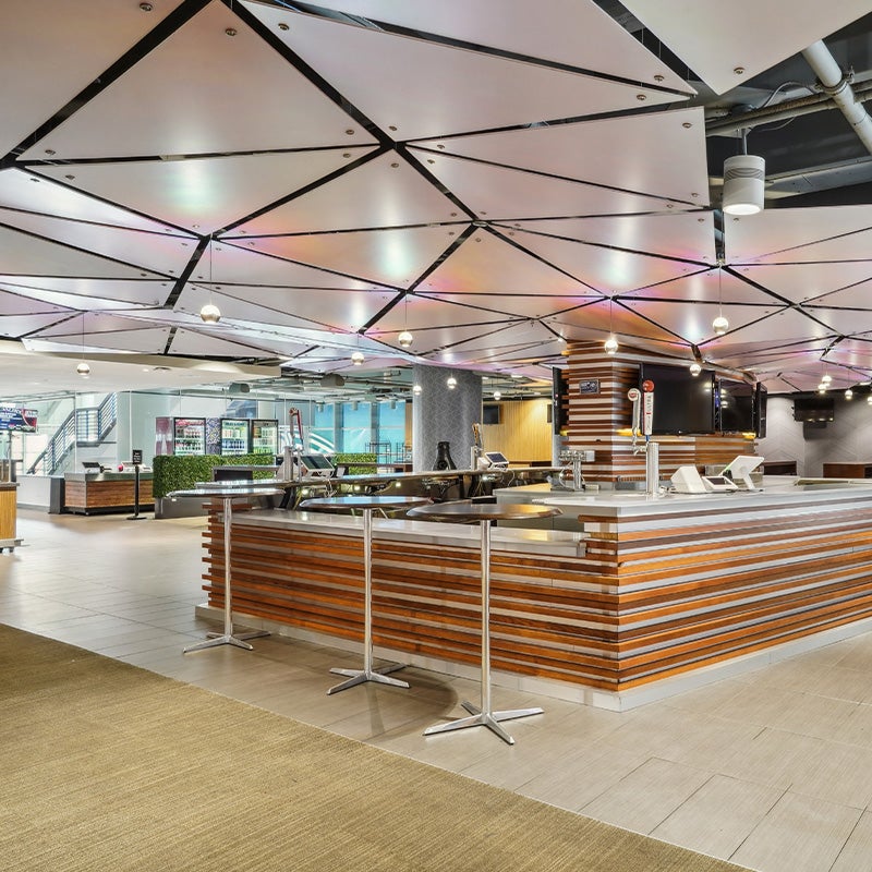 Located on the suite level, this newly-renovated space shines as an elevated experience for guests during an event. The HUB Club functions as a large suite with 150 fixed bowl seats, barstools and soft seating, complete with a full bar.